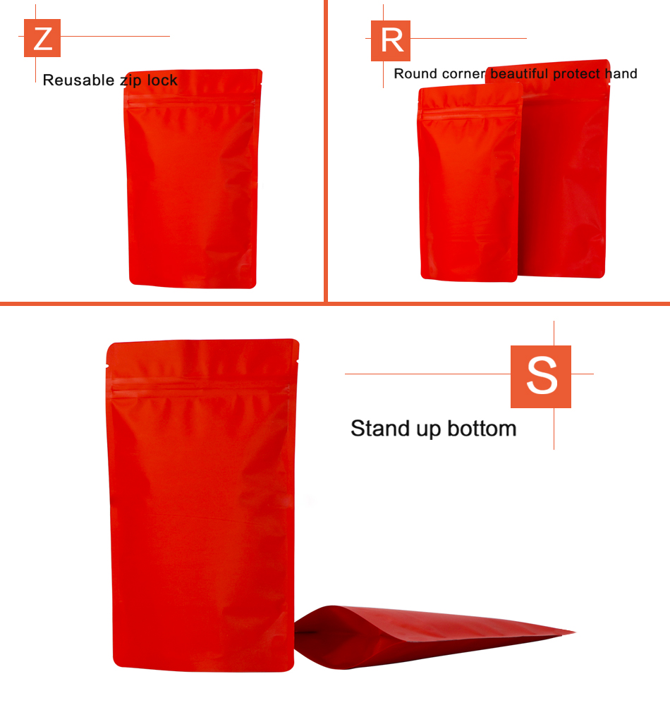 Features:Tear notch,Rounded Corner Geometry,supports industrial heat sealing ,Reusable press-to-seal zipper ,consumer-friendly stand-up features